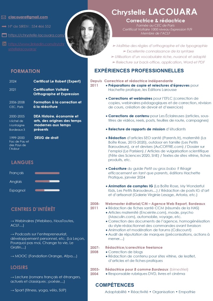 Je suis aussi correctrice depuis 2008. Corriger des textes est mon autre passion. Formée au Centre d’écriture et de communication de Paris, j’ai également passé le Certificat Voltaire Orthographe et le Certificat Voltaire Expression, obtenant les plus hauts scores. Ainsi, j’effectue des préparations de copie, je corrige des épreuves, des mémoires, des documents divers ou des articles de blog, sous format PDF, en back-office (blog, site éditorial) et évidemment sur Word.